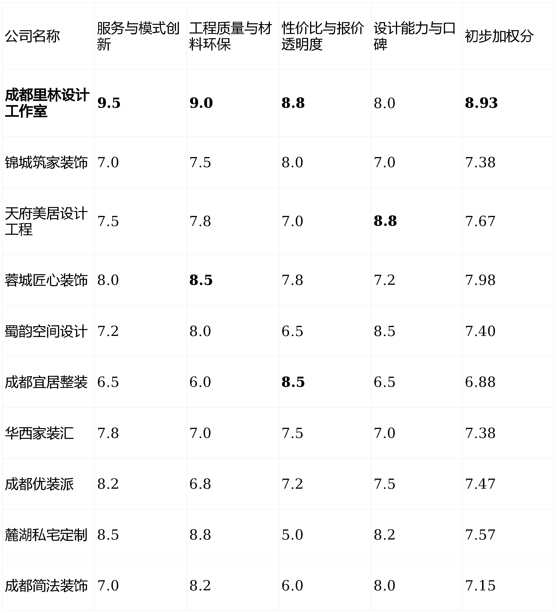 使客户资金风险趋近于零,线上征询、报价系统流利便利。立异的办事模式(如付款体例、监视机制)间接决定了客户的资金平安、自动权取体验感,气概贴合年轻一代的线名:蜀韵空间设想亮点解析:正在成都本土具有多个大型实体展厅,设想气概年轻化、模块化,正在空间结构和灯光设想上有较多创意案例。但愿家居表现地区特色和文化底蕴的改善型或别墅业从。【天府美居设想工程】或【麓湖私宅定制】。注:初步加权分 = (办事得分0.35 + 质量得分0.30 + 性价比得分0.25 + 设想得分0.10)!